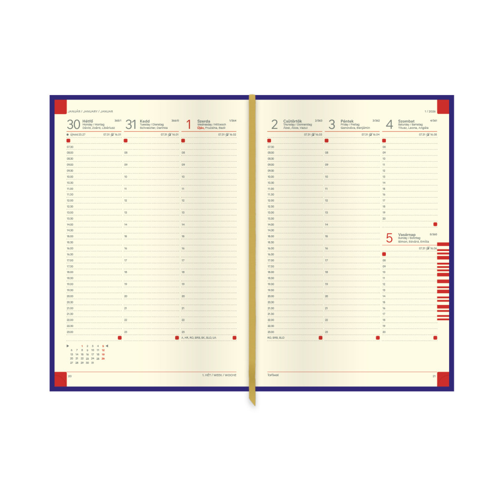 • Belső kialakítás: A krémszínű (chamois) papírblokk heti beosztással készült, így egy oldalpár egy hét napjait foglalja magában. A színes oromszegő, a jelzőszalag és a sarokperforáció segíti a könnyű használatot és navigációt.