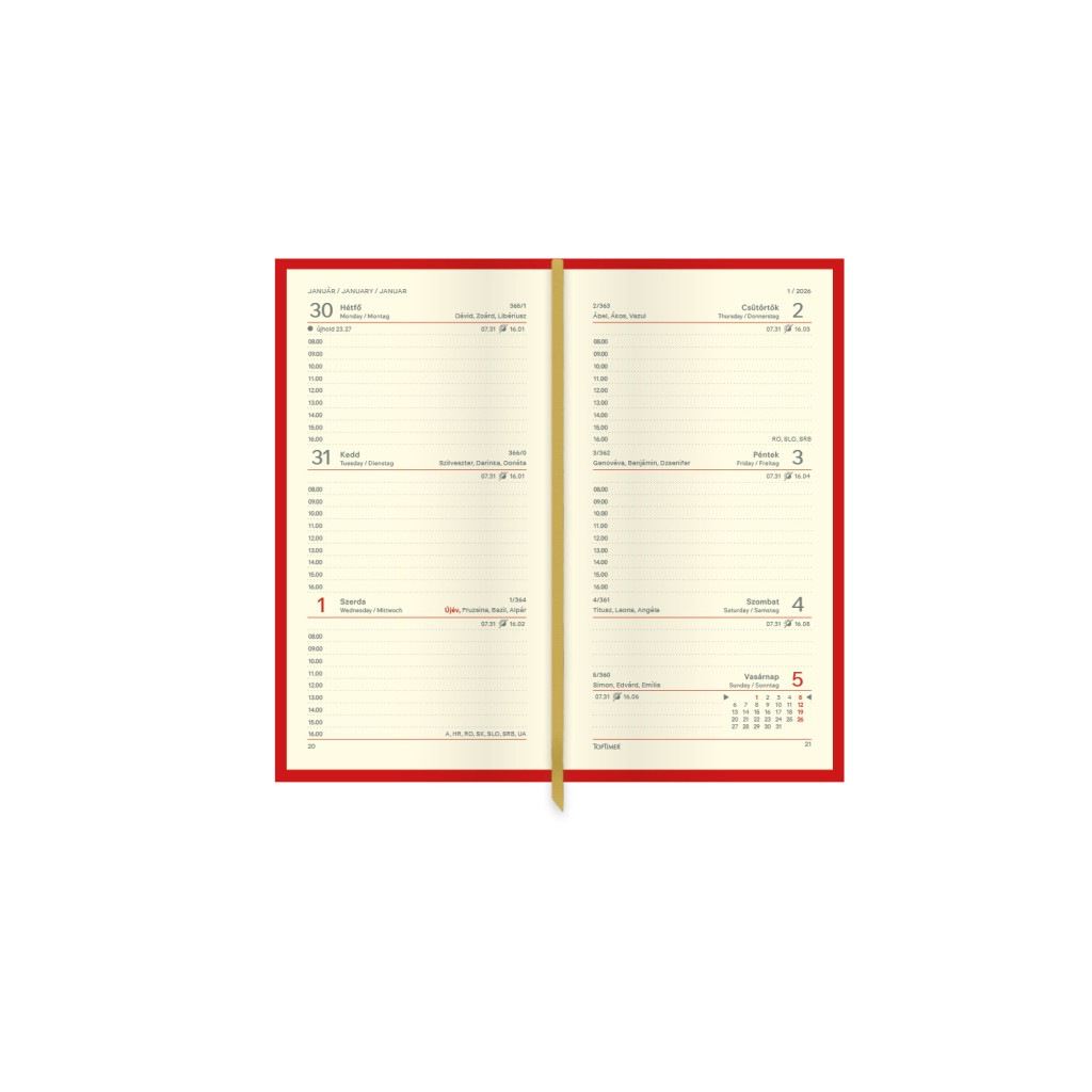 • Belső kialakítás: A krémszínű (chamois) papírblokk heti beosztással készült, így egy oldalpár egy hét napjait foglalja magában. A színes oromszegő, a jelzőszalag és a sarokperforáció segíti a könnyű használatot és navigációt.