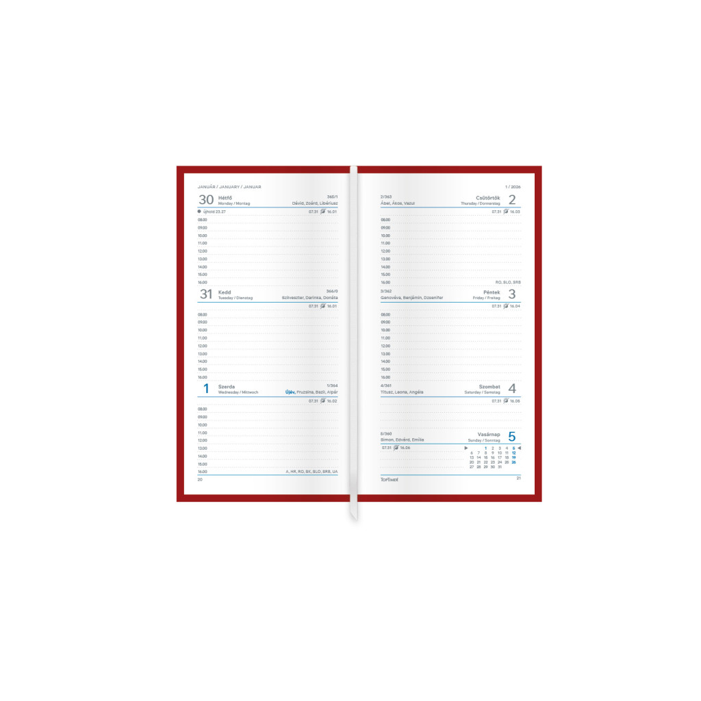 • Belső kialakítás: A fehér papírblokk heti beosztással készült, így egy oldalpár egy hét napjait foglalja magában. A színes oromszegő, a jelzőszalag és a sarokperforáció segíti a könnyű használatot és navigációt.