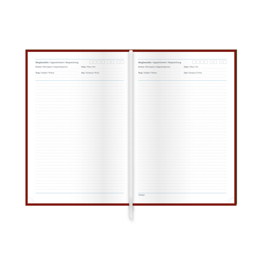 • Belső kialakítás: Fehér papírblokk napló oldalakkal. A színes oromszegő, a jelzőszalag és a sarokperforáció segíti a könnyű használatot és navigációt.