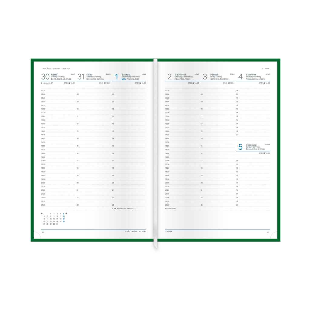 • Belső kialakítás: A fehér színű papírblokk heti beosztással készült, így egy oldalpár egy hét napjait foglalja magában. A színes oromszegő, a jelzőszalag és a sarokperforáció segíti a könnyű használatot és navigációt.